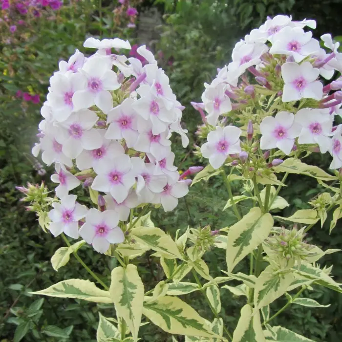 Листья волнистые по краю, темно-зеленые с белой, позднее светло-лимонной, неравномерной перьевидной каймой. Цветки розовато-белые с розовым глазком, расплывающимся по мере отцветания. Цветок звёздчатой формы, 2-2,5 см в диаметре. Соцветие округло-коническое. Куст мощный, прочный, выстой 70-100 см. Разрастается медленно. Цветение продолжительное в поздние сроки. Цветение июль-сентябрь.