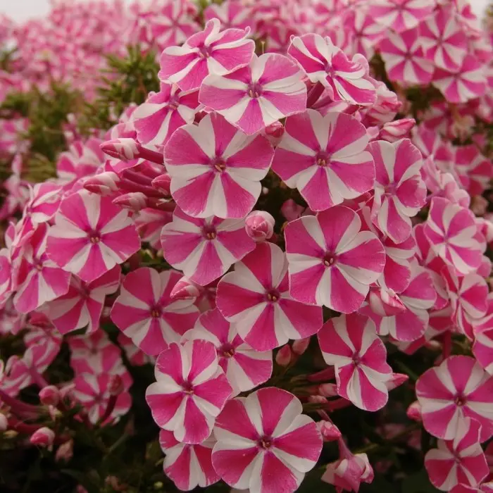 Флокс Pepermint Tvist. Растение компактное, невысокое, 50 см, образует прямые стебли, украшенные светло-зеленой листвой. Растение отличает пестрый окрас и аромат: лепестки привлекают внимание за счет розовых и белых полос. Саженец флокса метельчатого Peppermint Twist прекрасно переносит зиму без укрытий, в летнее время требуется полив в засушливый период. Флокс цветет даже в тени, начиная с июля. Особенностью сорта является неприхотливость в уходе. Достоинства: зимостойкость, иммунитет к заболеваниям, декоративность.