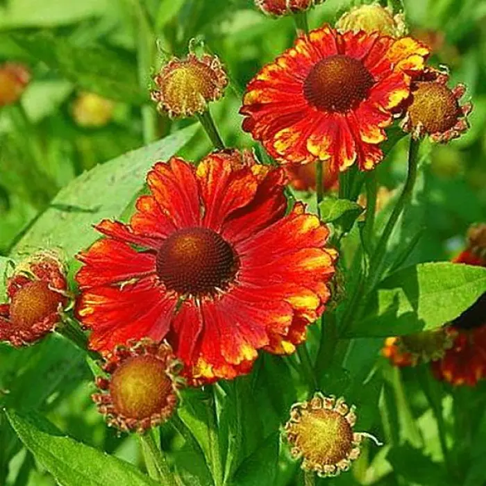 Гелениум Chelsey. Декоративный многолетник высотой до 75 см. Листья сидячие, продолговато-ланцетные с мелкозубчатым краем. Цветы оранжево-красные, с коричневым центром и жёлтыми полосами на краях лепестков. Цветёт с середины июля. Цветы - корзинки до 3 см диаметром.
