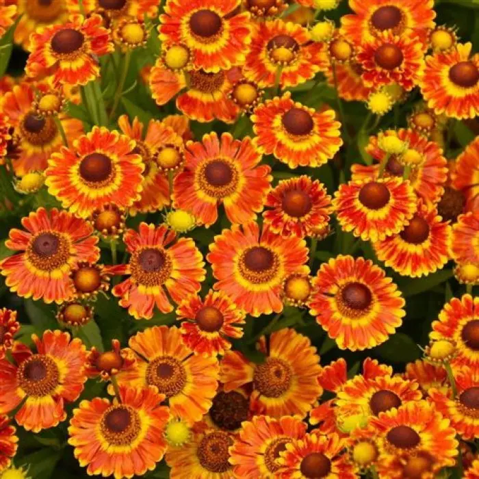 Гелениум Fuego. Цветки многочисленные, ромашковидные, яркие, красно-оранжевые с золотистым ореолом и коричневым центральным диском. Цветоносы прочные, хорошо разветвлённые. Цветение в августе-октябре. Листья копьевидные, зубчатые, тёмно-зелёные. Высота 40-50 см и ширина 50-60 см. Прекрасное растение для срезки. Место солнечное. Почва плодородная, влажная, дренированная.