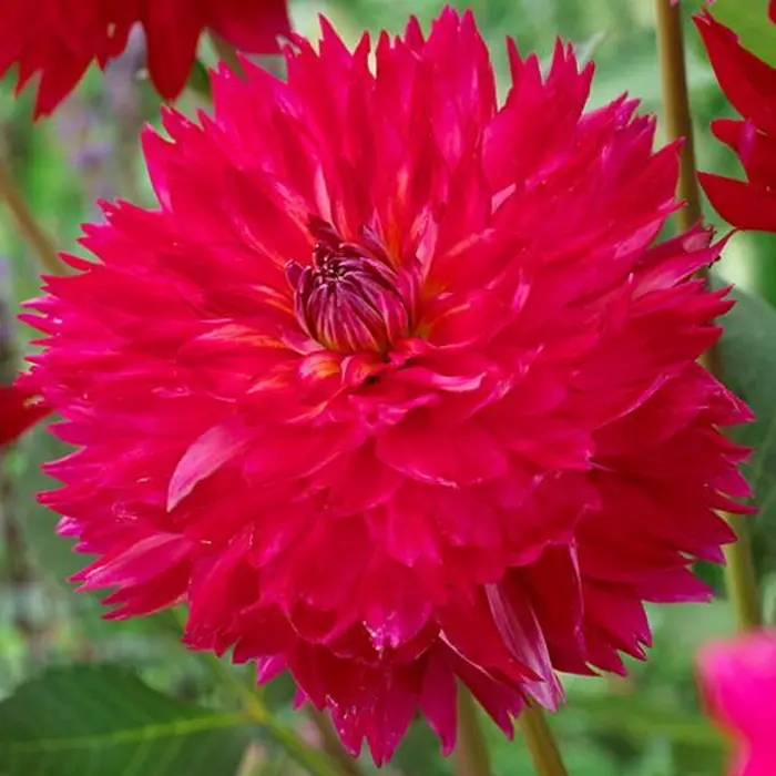Георгина Soulmate. Цветы на длинных прочных цветоносах в роспуске достигают 15-16 см. Соцветия состоят из многочисленных вино-красных лепестков с разделенными краями. Из-за этих «зубчиков» сорт напоминает кактусовый. Высота взрослого растения достигает метра, а иногда и превышает его. Настоящее украшение сада.