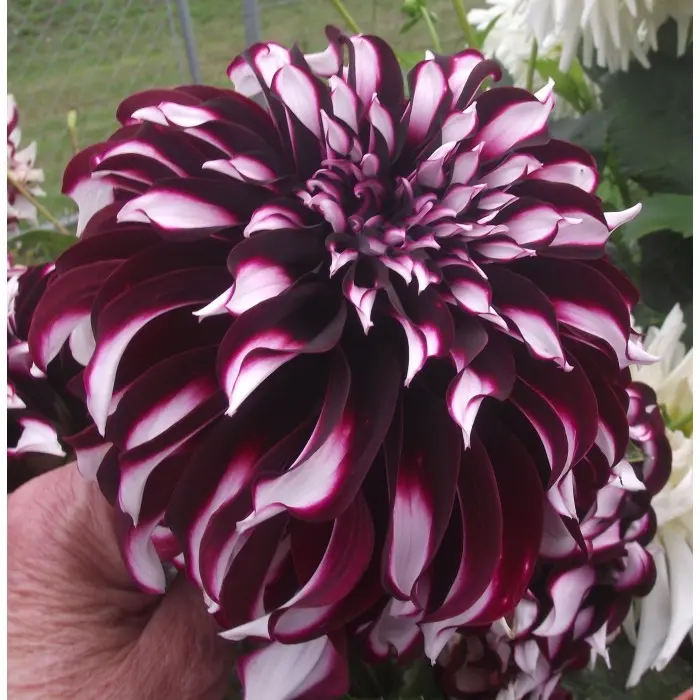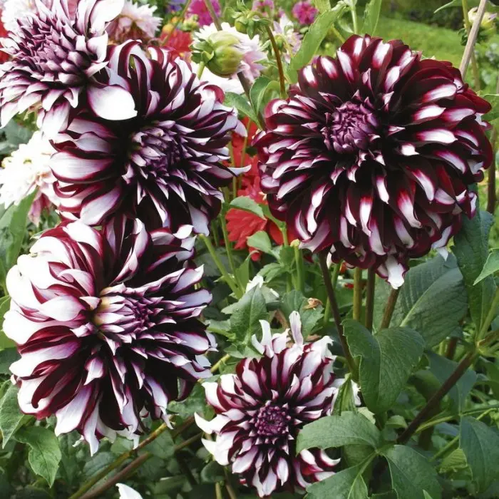 Георгина Tartan. Растение высокорослое, достигает 130 см. Сам цветок относится к категории крупных, средний диаметр превышает 15 см. И самое главное – это удивительная расцветка. Перьевидные лепестки имеют вишневый цвет с белыми штрихами. Цветет георгина в среднем три месяца: с июля по сентябрь. По сравнению с другими сортами зацветает достаточно рано.