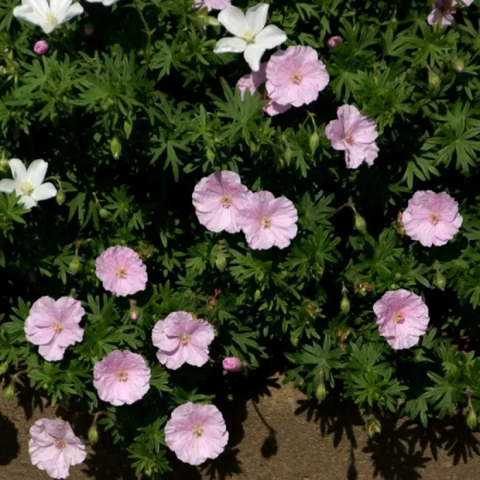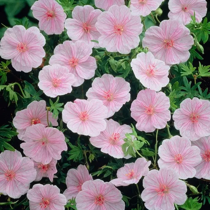 Герань кроваво-красная var. Striatum. Эффектный почвопокровный неприхотливый многолетник. Высота 15 см. Цветки диаметром 2,5- 3 см нежно- розовые с более темными прожилками. Листья сочного зеленого цвета, пятилопастные. Осенняя окраска листвы ярко-малиновая. Период цветения июнь- август. Стебли вильчато-разветвленные, к концу вегетации вместе с листьями краснеющие. Цветение июнь-август. Зона Зимостойкости 3.