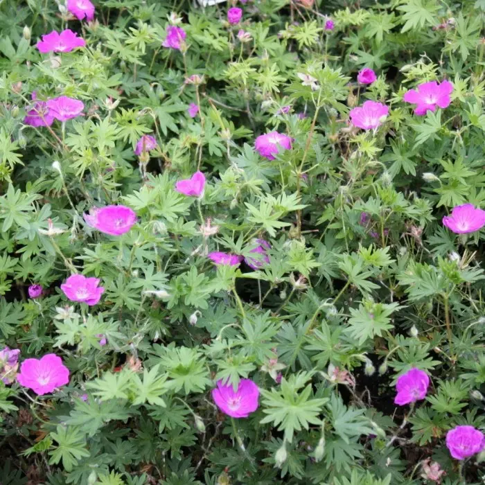 Герань кроваво-красная Vision Violet. Куст герани обладает сферической формой, а листья имеют серо-зеленую окраску. В преддверии зимы листья приобретают красную расцветку. Вырастает до 30 см. Диаметр цветков до 4 см. Цветение начинается в июне и заканчивается в августе. Повсеместно обсыпается цветами в карминно-красных оттенках Относится к 4-й зоне зимостойкости.