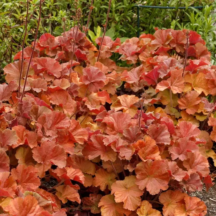 Гейхера Нозерн Икспожэ Амбер - травянистый , корневищный, многолетник. Куст компактный, рост активный, быстрый высота 0,25 м, ширина 0,3 м, цветонос высокий , цветки кремово-желтые. Листья плотные, ажурные, рифленые, округлые, янтарно-красные, меняется. Зона зимостойкости 4.