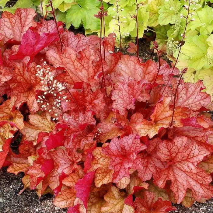 Гейхера гибридная Paprika. Сорт, относящийся к числу травянистых многолетников. Формирует быстрорастующие растения с типичной для данного вида высотой, не превышающей 20-25-сантиметровую отметку. Обладает примечательной особенностью - оригинальной формой и окраской листьев, резко выделяющих этот сорт на фоне прочих декоративных садовых растений, применяющихся в декоративных целях. Зубчатые широкие листья, визуально напоминающие кленовые, по весне обретают ярко-оранжевый оттенок с малиновыми прожилками, переходящий к лету в вишнево-коралловый.