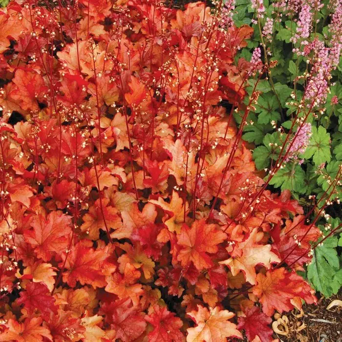 Гейхера Peach Flambe - трижды за сезон меняет цвет своих листьев, от красно-оранжевого - весной, персикового оттенка летом, к сливовому осенью. Компактный куст имеет густую и плотную структуру стеблей и листвы. Высотой около 25 см, шириной до 40 см. В начале лета, появляются воздушные белые крошечные колокольчики, собранные в ажурные метелки. Цветет с июня по июль.
