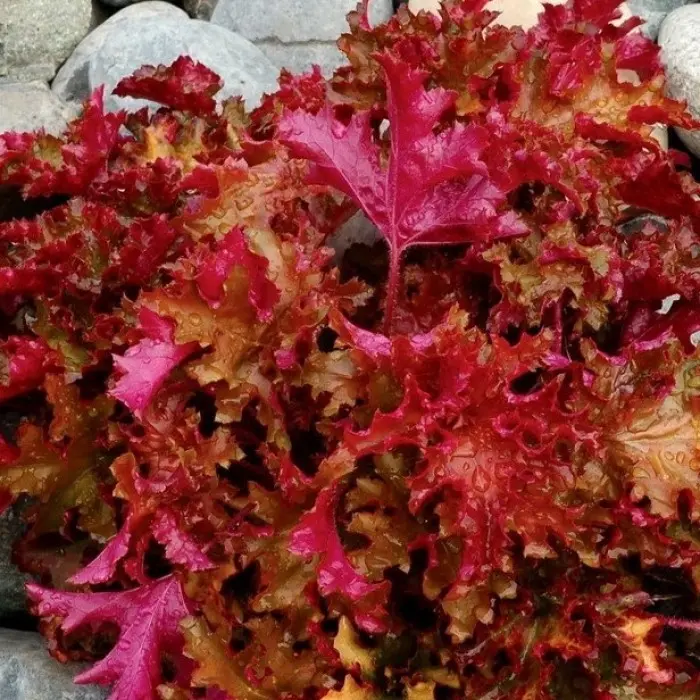 Гейхера гибридная Zipper. Листья крупные, яркие, глянцевые, сильно гофрированные, с весны до осени меняют свой цвет от оранжевого до розово-пурпурного и золотисто-янтарного, всегда с пурпурноокрашенной обратной стороной. Цветение в июне. Высота листьев 20 см, высота цветоносов 45 см. Сорт засухоустойчивый. Место полутенистое или солнечное. Почва дренированная. Зона 4 (до -29?С).