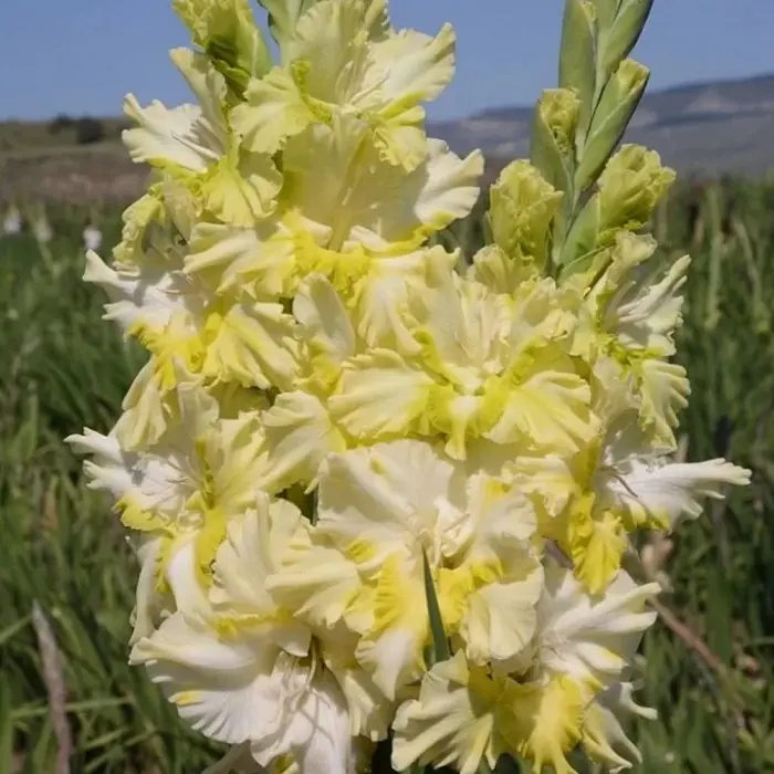 Гладиолус Abkhazia. Высота 140 см. Соцветие 70 см. 22 бутона (8-9 одновременно открыты). Нежно-кремово-лимонный цветок с яркими лимонно-салатовыми пятнами на нижних лепестках. Гофрирован крупными складками по краю лепестков. Стройный, идеально двухрядный колос. Цветки размером более 14 см. Срок цветения средний.