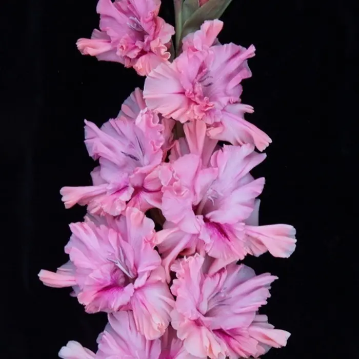 Гладиолус Амурное настроение. Крупный, очень гофрированный цветок, благородного палево-розового цвета. Мелкая зубчатая гофрировка. В прочном плотном соцветии может быть 9 одновременно открытых цветков из 20. Срок до цветения 85-90 дней. Высота 140 см. Отлично стоит в срезке. Срок цветения средний.