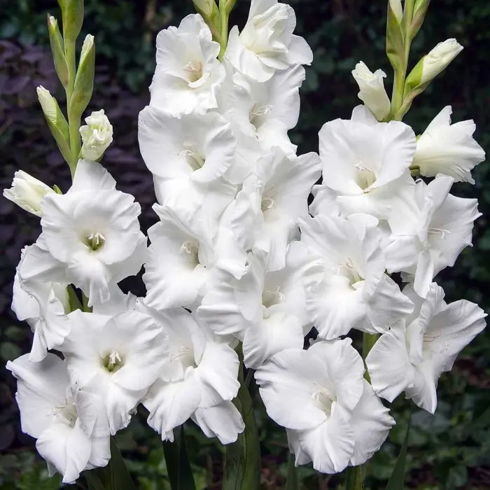 Гладиолус Bangladesh. Высотой от 80 до 110см. Имеет вертикальный неветвящийся стебель и линейные листья. Привлекает внимание крупными и пышными белоснежными цветками диаметром до 14см, собранными в вертикальные соцветия. Элегантный и величественный гладиолус Бангладеш станет фаворитом сада на исходе лета.