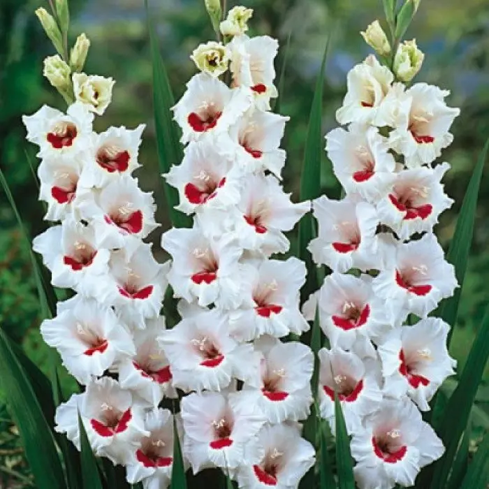 Высота 90-110 см. Длина колоса 40-50 см. Цветок белый с винно-красным пятном в центре, лепестки слегка гофрированныею. Бутоны – нежно розовые. Цветок размером 13 см - 15 см.