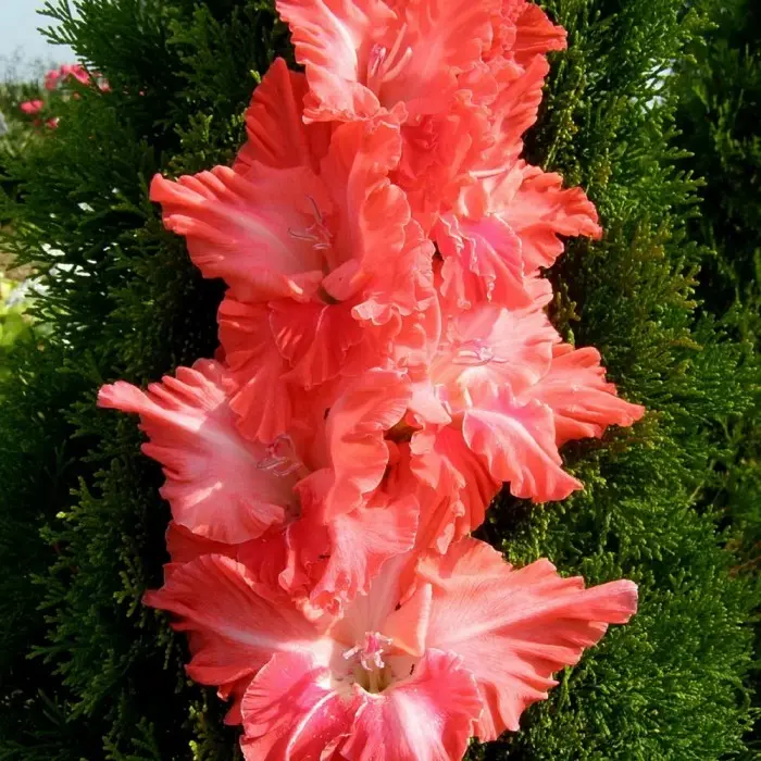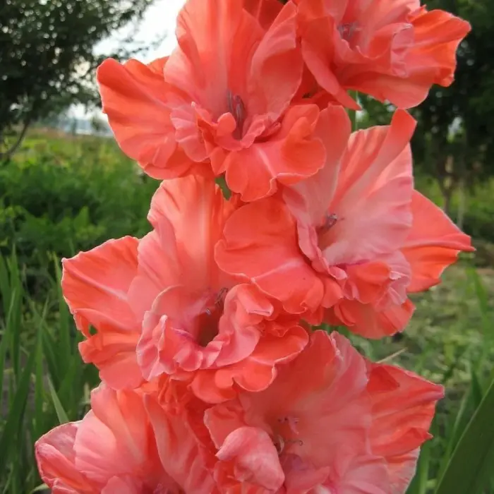 Гладиолус российский Малика. Разбор луковиц Экстра! Высота растения 150-160 см. Цветок очень яркий, лососево-розовый с размытым насыщенно-малиновым пятном на нижних лепестках. Соцветие - 85 см, количество бутонов - 22-24 (одновременно открыты 8-9). Бутон крупный - 15-18 см. Хорошо гофрирован.