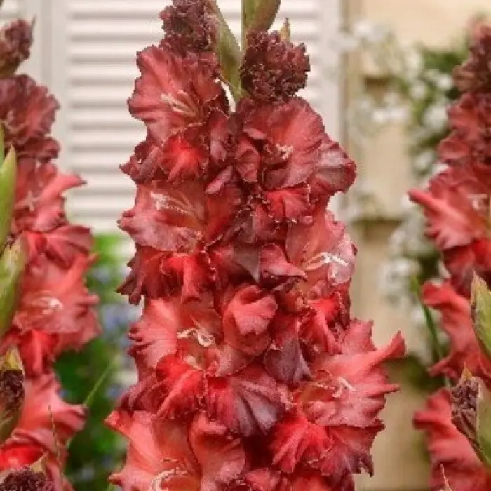 Разбор 10/12. На удивление красивый гладиолус, выведенный голландской компанией Lefeber.Необычайность ему придают гофрированные лепестки красно-кирпичного цвета. За счёт волнистых краёв они как бы играют с оттенком, который невозможно уловить визуально. Лепестки кажутся то темнее, то светлее, то насыщенно алыми, то коричнево-бордовыми. Шпажник формирует цветонос до 60 см, при этом высота самого растения 100–110 см. Зацветает Омск в августе и цветёт на протяжении месяца.