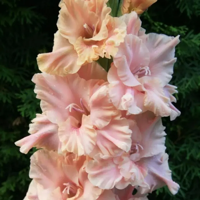 Гладиолус российский Розовый Алмаз. Разбор луковиц Экстра! Высота 135см. Соцветие 70см, 22-23 бутона (8-9 одновременно открыты). Бутон 12,5см. Лососево-розовый, спокойного, насыщенного тона. На нижнем лепестке небольшое кремово-белое пятно. На боковых лепестках просветления-стрелки того же кремово-белого тона.