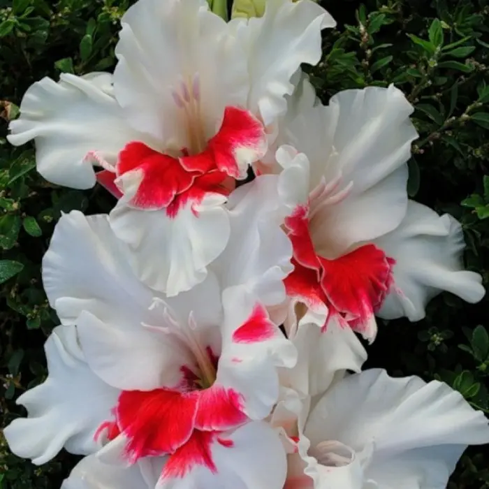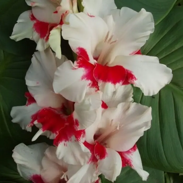 Гладиолус российский Весточка. Разбор луковиц Экстра! Высота 170-180см. Бутон 15см. Чистого белого цвета с крупными наплывными малиново-красными пятнами по середине нижних лепестков, переходящими иногда по кругу на верхние лепестки и малиновым напылением в горле. Сильно гофрирован крупными глубокими защипами по краям лепестков.