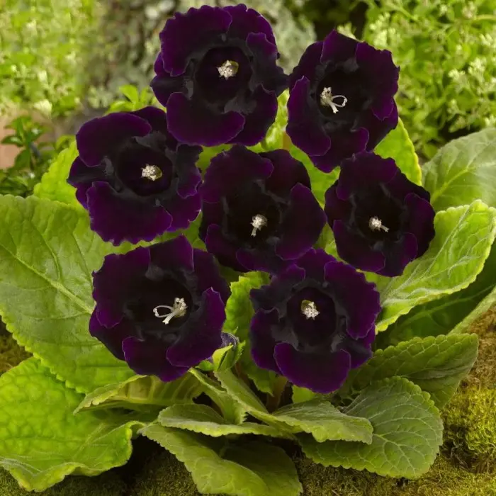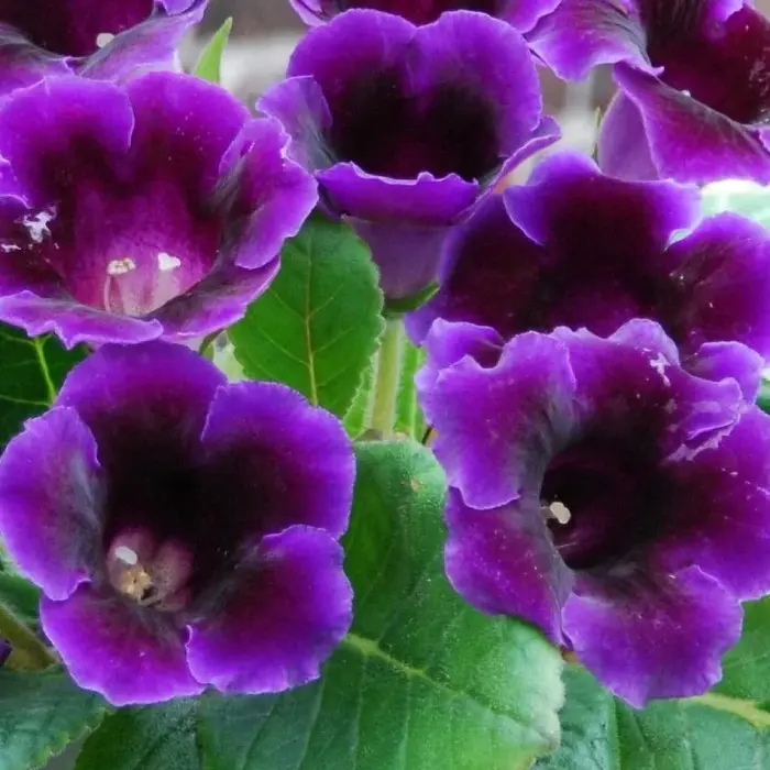 Глоксиния Violacea. Разбор 4/5. Цветки бархатного фиолетового оттенка с сиреневым кантом по краям слегка-гофрированных лепестков. Бело-кремовое горло исчерчено полосками и легкими веснушками такого же оттенка. Высота растения 25 см. Листья сочные, темно-зеленые, узорчатые, бархатистые, опушенные. Диаметр цветка 8 см. Аромат тонкий, душистый. Период цветения июнь-сентябрь.