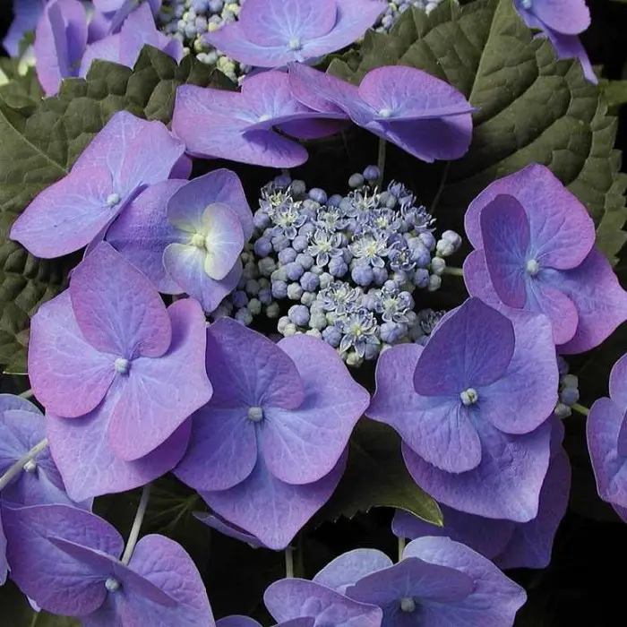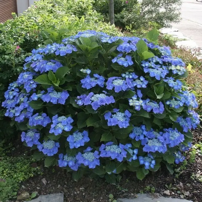Гортензия крупнолистная Blaumeise. Соцветия плоские кружевные, состоят из мелких центральных цветков и крупных эффектных краевых цветков голубого или синего цвета на очень кислых почвах и фиолетово-розовых - на щелочных. Цветёт в июле-сентябре на прошлогодних побегах. Куст компактный, высотой и шириной 90-130 см. Побеги крепкие. Место полутенистое. Почва дренированная, влажная. Требует укрытия на зиму, как для роз, чтобы сохранить цветковые почки. Укрывать нужно в сентябре, до наступления заморозков. Зона зимостойкости: 6 (-23 ° С).