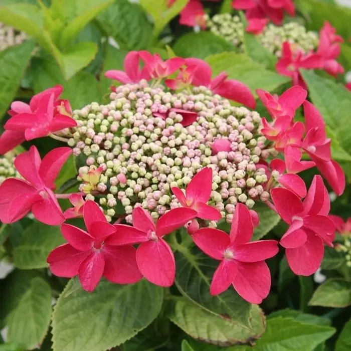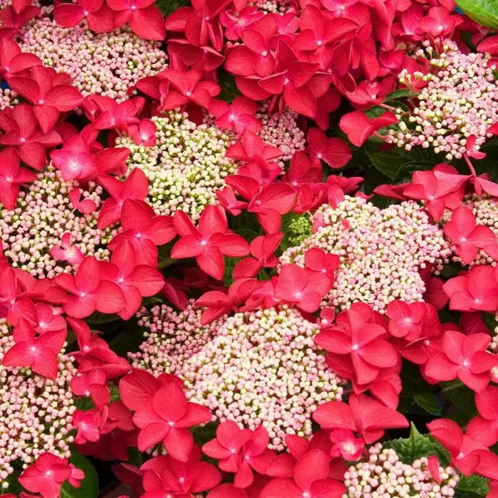 Гортензия крупнолистная Rotkehlchen. Плоские соцветия от темно-малиновых до фиолетовых, состоят из краевых крупных цветков с четырьмя лепестками и мелких центральных. Размер куста - 1-1,25 м. Для гортензии крупнолистной "Роткелхен" следует подобрать защищенное от холодных ветров место с плодородными, хорошо дренированными почвами, кислыми или слабокислыми, она совершенно не переносит известковые почвы; почву необходимо постоянно поддерживать во влажном состоянии. На зиму укрывают как розы, оберегая от промерзания цветочные почки, так как цветет гортензия только на прошлогодних побегах.