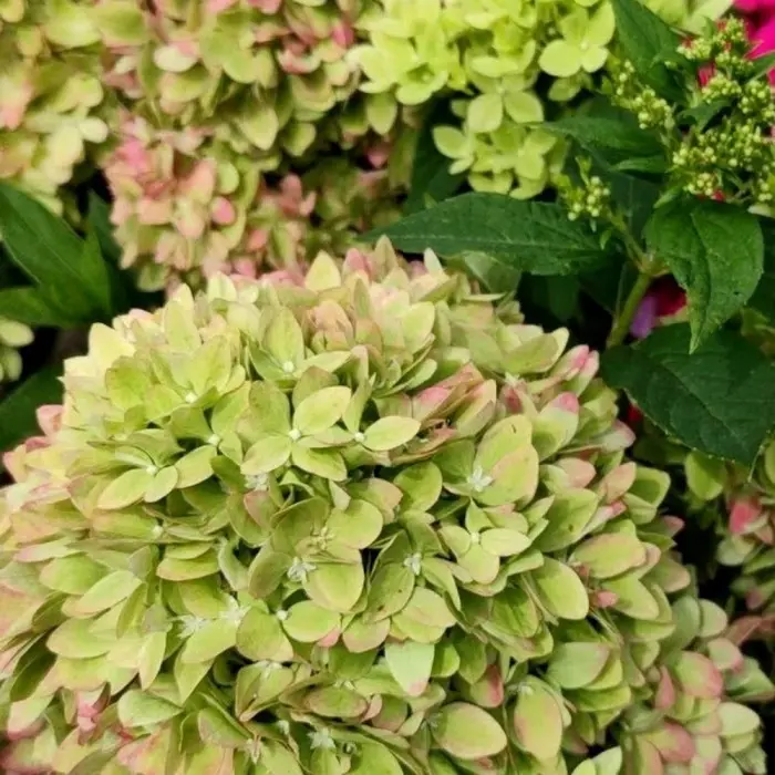Гортензия метельчатая Bee Green. Уникальная новинка от французских цветоводов. Соцветия этого сорта гортензии в течение лета окрашиваются сразу в четыре оттенка. Расцветка Би Грин – сложная, медленно переходящая от насыщенно-лаймового цвета к белому. В августе цветки приобретают розовый румянец, а затем – розово-пурпурную окраску. Соцветия умеренно большие - до 25 см, широкопирамидальные, плотные, состоящие из цветочков-звездочек. Куст компактный, стрессоустойчивый, среднераскидистый , с прямостоячими мощными побегами и умеренно густой кроной, высотой 80-90 см. Листья суженно-овальный формы, с кончиком-стрелкой и чуть завернутыми гладкими краешками, ярко-изумрудного цвета, полуглянцевые. Цветение кустарника продолжается от начала июля до второй половины сентября. Подходит для групповой и бордюрной рассадки, также для выращивания в контейнерах.