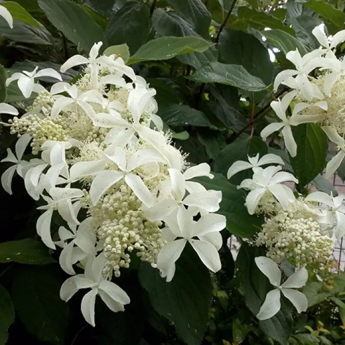 Гортензия метельчатая Great Star. Это один из наиболее оригинальных сортов гортензии метельчатой. Высокорослый и быстрорастущий сорт высотой и шириной 2,5 м. Соцветия в форме небольшой кисти,длиной:15-25 см. Цветки - 5 см в диаметре, а у основания кисти до-7-8 см , сидят на длинных цветоножках и, небольшие фертильные, их большинство: до 70-80%. Цветет с июля по сентябрь, чисто белыми, не меняющими окраску, цветками. Листья крупные, простые, зеленые, блестящие, немного морщинистые, овальной формы, с грубыми волосками по краю. Побеги светло-коричневые, грубые, очень прочные, толстые, прямые, хорошо держат форму куста.