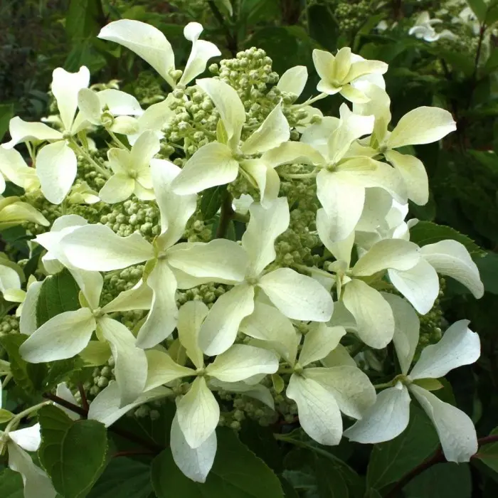 Гортензия метельчатая Great Star. Это один из наиболее оригинальных сортов гортензии метельчатой. Высокорослый и быстрорастущий сорт высотой и шириной 2,5 м. Соцветия в форме небольшой кисти,длиной:15-25 см. Цветки - 5 см в диаметре, а у основания кисти до-7-8 см , сидят на длинных цветоножках и, небольшие фертильные, их большинство: до 70-80%. Цветет с июля по сентябрь, чисто белыми, не меняющими окраску, цветками. Листья крупные, простые, зеленые, блестящие, немного морщинистые, овальной формы, с грубыми волосками по краю. Побеги светло-коричневые, грубые, очень прочные, толстые, прямые, хорошо держат форму куста.