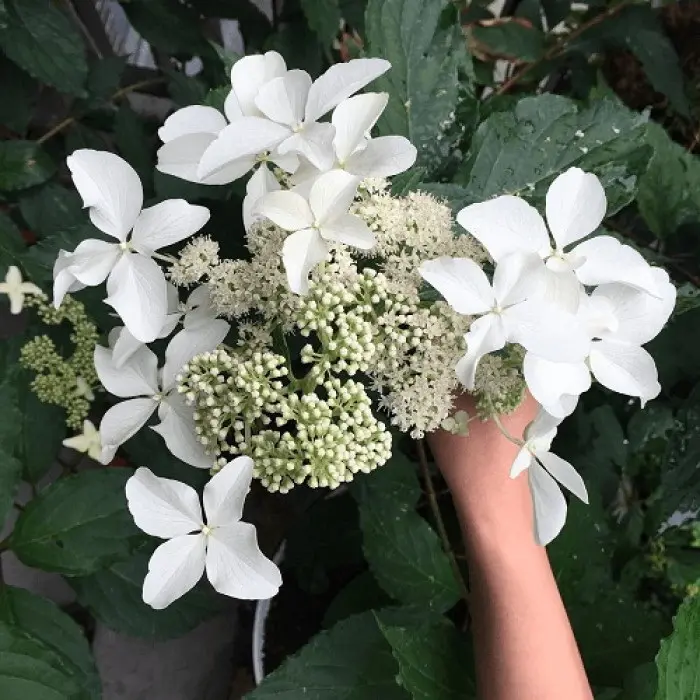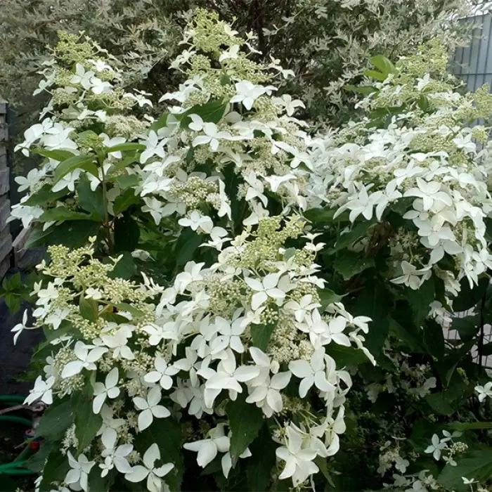 Гортензия метельчатая Magical Starlight. Куст высотой 1,6-1,8 м и такой же ширины, а потому крона смотрится симметрично, правильной округлой формы. Куст не разваливается и не требует подвязки. Побеги толстые, прочные, с красным оттенком, к моменту одревеснения становятся красно-коричневые. Лист зеленый, шершавый, крупный, элиптический, продолговатый с сильно заостренной вершиной. По всем параметрам удивительно похож на знаменитый сорт `Great Star`. Довольно рыхлое соцветие высотой 15-20 см имеет конусовидную форму и состоит из двух типов цветков: стерильных и фертильных, которых большинство. Стерильные цветки расположены в соцветии неравномерно, довольно крупные, состоят из четырех округлоовальных, удлиненных лепестковидных чашелистиков ослепительно белого цвета. Стерильные цветки удивительно красивы и элегантны, лепестки расположены в одной плоскости, широко расставлены и по форме напоминают звезду. Цветет с середины июня и почти до конца сентября.