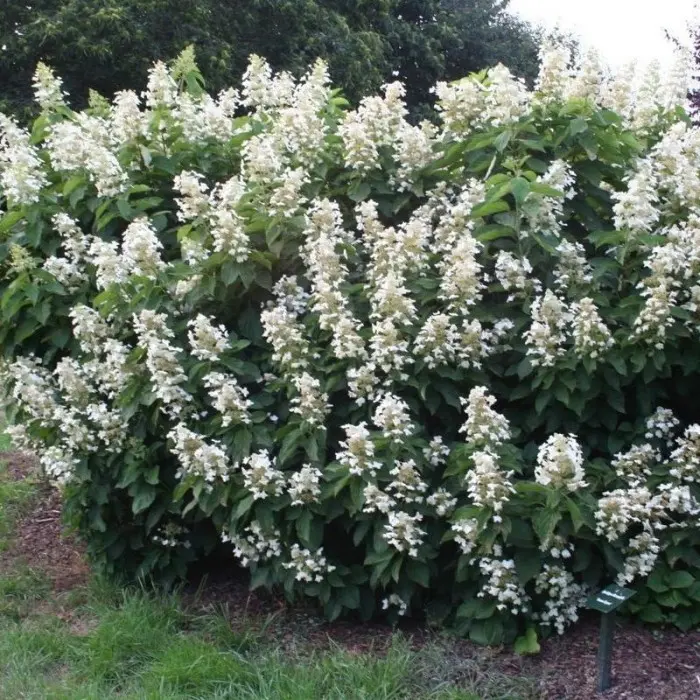 Гортензия метельчатая October Bride. Редкий сорт гортензии, имеющий поздний период цветения. Зацветает во второй половине сентября и цветет до заморозков. Основной период цветения - октябрь. Соцветия длинные,15-20 см, конические, заостренные, состоящие из белоснежных стерильных и фертильных цветков. Они растут на очень прочных стеблях. Декоративные большие, листья, подчеркивают обильно цветущие соцветия. Куст пышный, достигает высоты 2,5 - 3-х метров, а в ширину 1,5 - 2 метра. Устойчив к болезням и нетребователен к почвам. Устойчив к морозу.
