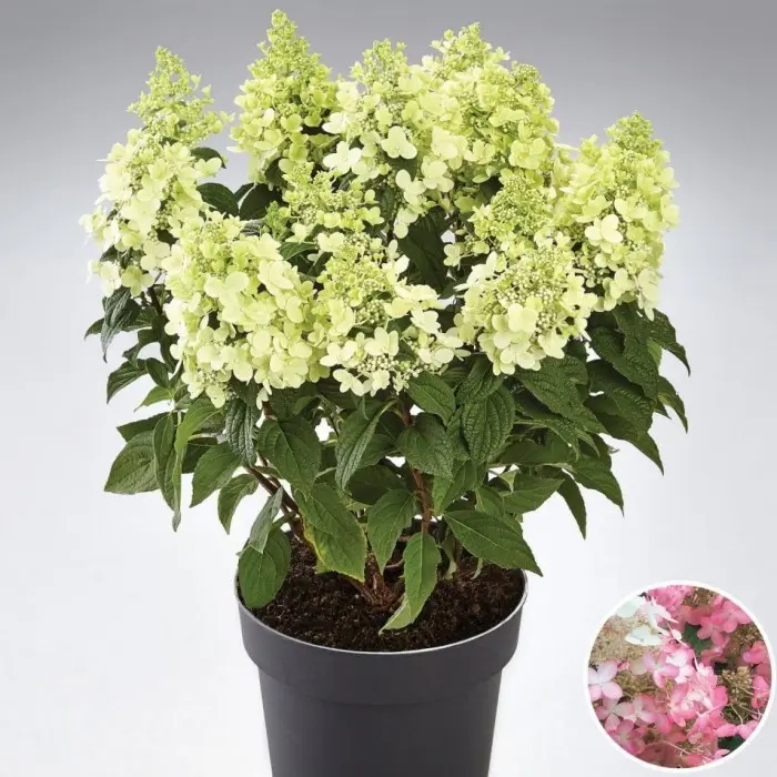 Гортензия метельчатая Panzola. НОВИНКА!Стерильные цветки диаметром 3-4 см, из 4-5 лепестков, меняют окраску с лимонно-белого, светло зеленого на темно-розовый, осенью красноватые. Соцветия кружевные, узкие, конические, длиной 15-20 см. Цветение в июне-августе по сентябрь. Куст компактный, от округлой до конической формы, высотой 100-120 см. Ветви прочные.. Почти не требует обрезки для регулирования роста. Отлично подходит для посадки в контейнере. Сорт неприхотлив, морозостоек.