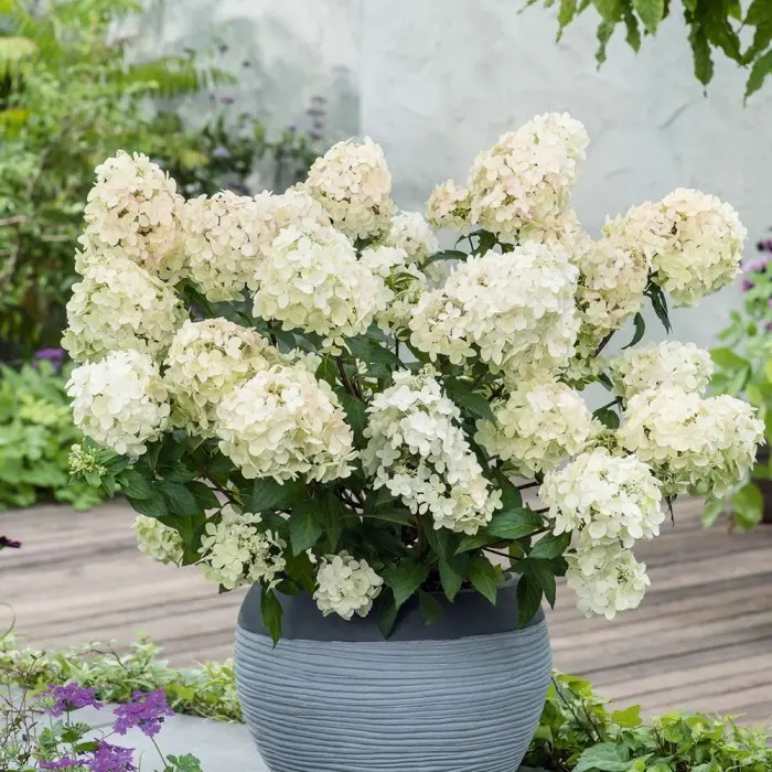 Гортензия метельчатая Petite Star. Новый сорт! Куст компактный, высотой 55 см и шириной 95 см, что делает его идеальным растением для выращивания в больших горшках. Соцветия плотные, длиной 15 см и шириной 15 см, во время полного расцвета покрывают всё растение. Цветки вначале салатовые, быстро меняют цвет на белый, в августе появляются розовые тона, а в начале сентября цветки полностью окрашиваются в красный цвет. Цветение обильное, с июля до октября. Жаростойкость очень хорошая. Место солнечное. Почва влажная, дренированная.