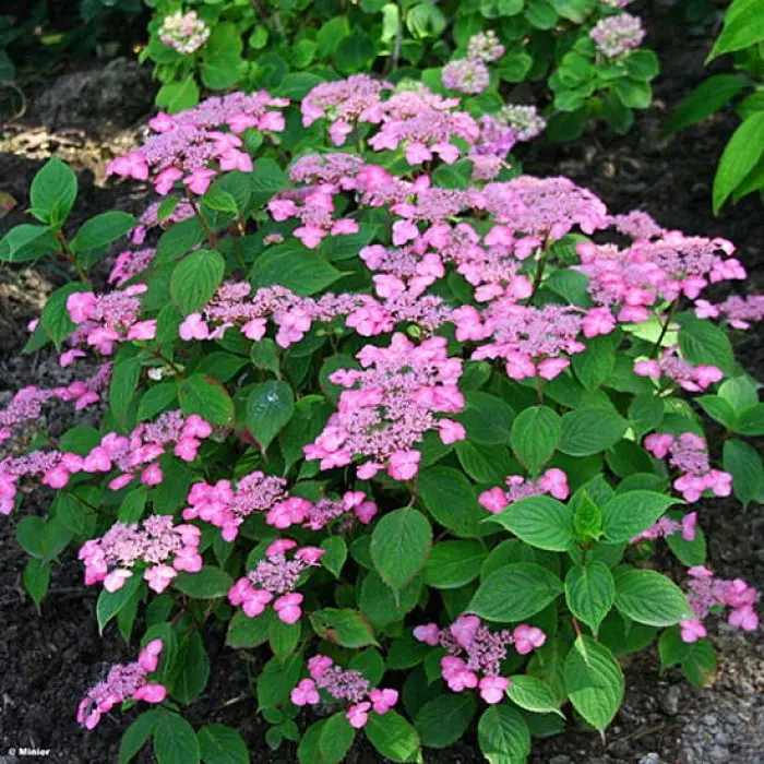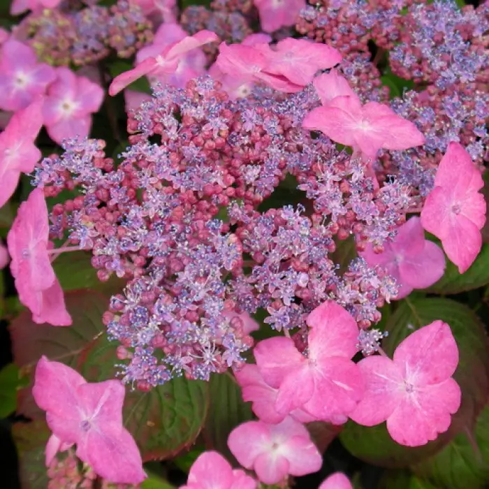 Гортензия пильчатая Avelroz. Очень красивый сорт пильчатой гортензии. Куст высотой 100 см, шириной 80 см. Цветки в начале цветения бледно-розовые, затем темнеют и к концу цветения становятся малиново-красными. На кислой почве цветки синеют. Соцветия плоской формы, небольшие. Цветёт обильно в конце июня-августе. Молодые весенние листья фиолетовые, затем зелёные, осенью пурпурные. Место солнечное. Почва дренированная (растение не переносит избытка влаги в почве). На зиму требует укрытия. Зона 5 (до -23°С).