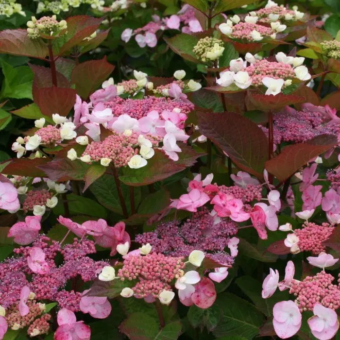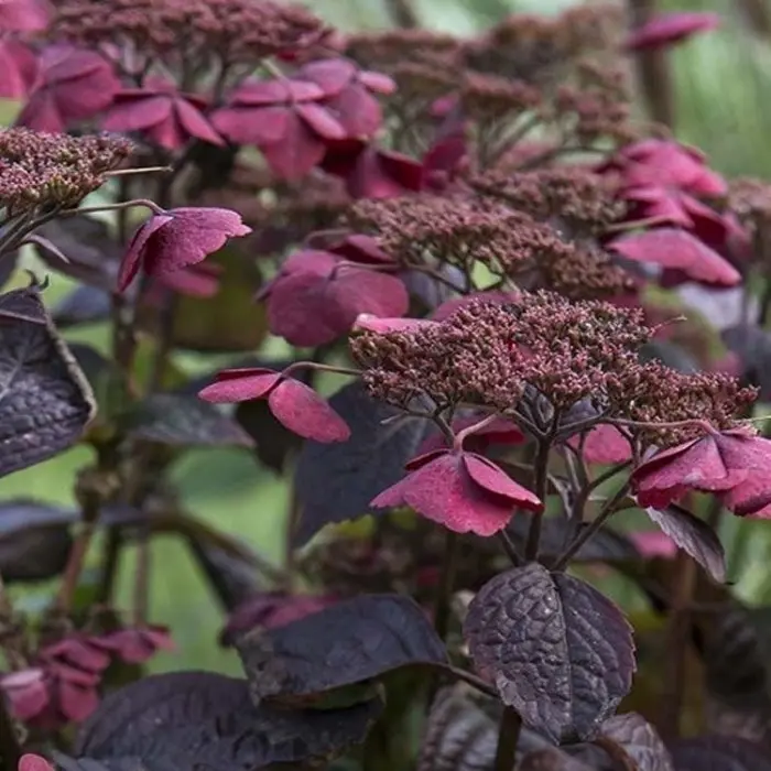 Гортензия пильчатая Daredevil. Листья этой гортензии сохраняют насыщенный темный бронзовый оттенок до зимы. А цветки красивы даже в сухом виде. Компактный округлой формы кустарник раскидывает плотную крону до 1 м в диаметре при высоте до 0,6 м. Молодые стебли с темно-красной корой несут на себе в очередном порядке темно-зеленые пильчатые морщинистые листья. В конце лета цвет темнеет до пурпурно-шоколадного. На концах побегов в июле появляются плоско-щитковые соцветия. На кислой почве они окрашены в темно-пурпурный цвет. На более щелочных грунтах окраска ярко-розовая. В соцветиях есть и плоские стерильные и круглые плодущие цветки. Гортензия даже на солнце не выгорает. Почва должна быть умеренно влажной и дренированной. Полуметровые кусты хороши для окантовки клумбовых композиций и для создания невысоких живых изгородей.