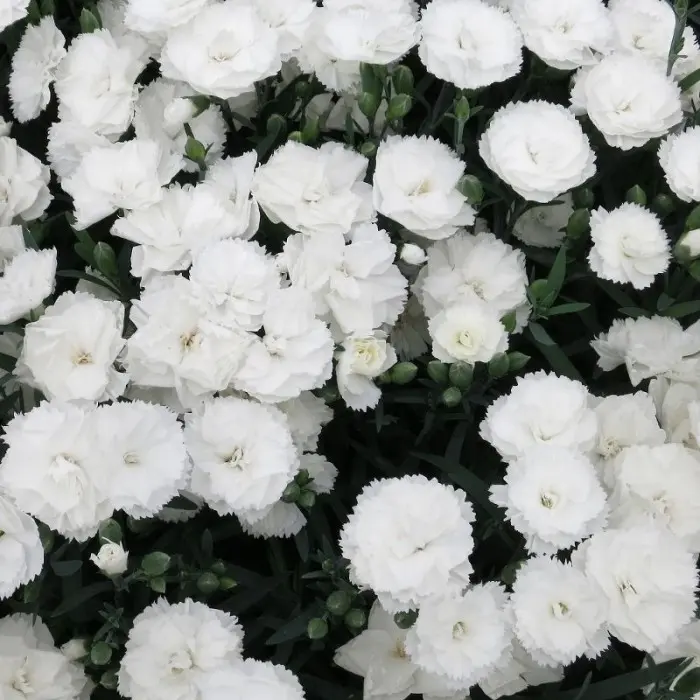 Гвоздика DINAMIC WHITE. Можно выращивать в помещении и на открытом воздухе. Цветет с весны до поздней осени, и полностью морозостойка. Растения образуют аккуратный компактный кустик с травянистой листвой, полностью махровыми белыми цветками диаметром 3-6 см. Высота 10-15 см, ширина 15-20 см.
