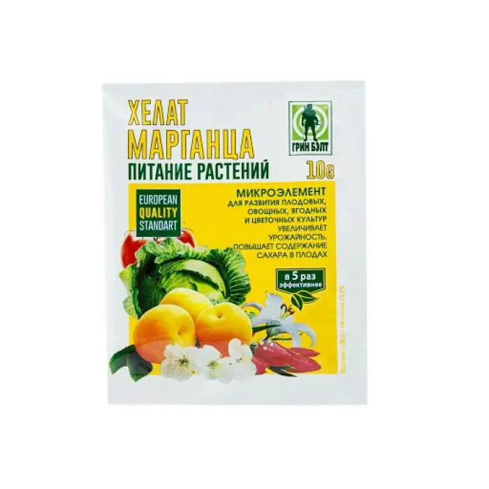 Недостатки марганца у растений вызывает хлорозы, пятнистости, ожоги. Микроудобрение используют для цветочных, плодовых, ягодных и овощных культур.