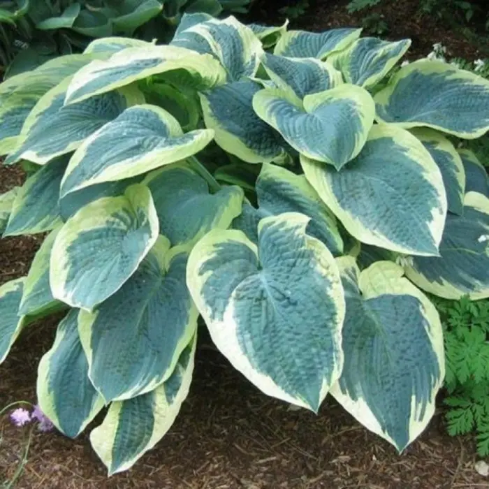 Хоста American Halo. Мощный куст растет в виде большого плотного купола. Листья толстые, овальные сильно жатые и гофрированные. Сине-зеленый центр листа окаймлен желтовато-белой каймой. Эффектное растение заднего плана. Гигантская хоста. Размер листа: 35 х 25 см. Высота куста: 60 - 80 см. Ширина куста до 80 см. Период цветения июнь-июль.