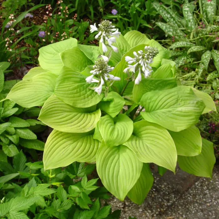 Листья хосты Банана Кид сердцевидные, очень плотные, с глубокими рельефными прожилками. На однородном фоне пластины они очень хорошо заметны, что усиливает их фактуру. Банана Кид – компактный сорт, вырастает до 40 см. Ширина – 60 см. Он гармонично впишется в ваш цветник, с его помощью можно создать аккуратные небольшие бордюрные посадки. Последнее пригодится на том участке, где узкие тропинки! Также хоста красиво смотрится у водоёмов, где ей будет всегда достаточно влаги, или в крупной композиции из разных видов хост, при этом с абсолютно любыми окрасками листьев.