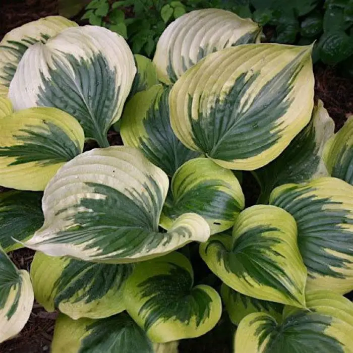 Хоста Broadway. Очень яркая, она притягивает к себе внимание благодаря листьям удивительной окраски серо-зеленого цвета с широкой перьевидной каймой. Цвет каймы от желтого до кремово-белого цвета. Кайма не равномерная. Листья достаточно плотные, немного жатые. Куст раскидистый, высотой до 50 см. Ширина куста до 45-60 см. Период цветения июль-август.Зона зимостойкости: 3 (-40 ° С)