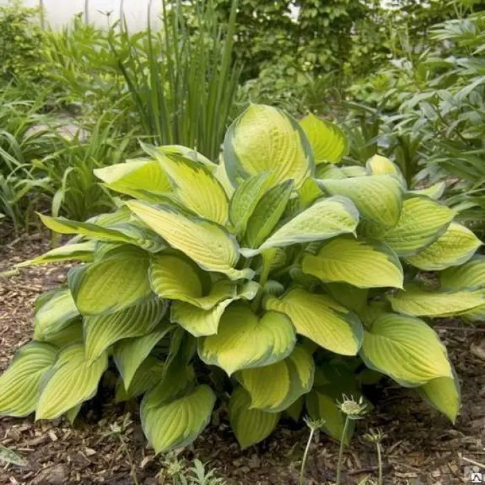 Хоста Gold Standard. Весной листья светло-зеленого цвета с темно-зеленой каймой по краю. Затем центр листа становится золотистым, и хоста приобретает более яркую окраску. Яркость зависит от количества солнца. При полной освещенности золотистый превращается в почти белый. Цветки - светло-лавандовые. Куст высотой до 60-70 см. Ширина куста до 90-120 см. Период цветения июль-август.Зона зимостойкости: 3 (-40 ° С)