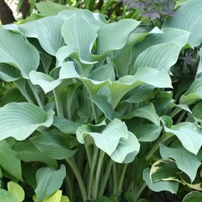Хоста Krossa Regal — большая роскошная (размер L), со временем разрастается в ширину до 150 см. Листья размером 27х17 см, морозно-сине-зелёные на длинных почти вертикальных черешках. Цветки светло-фиолетовые. Высота листьев 70 см, высота цветоносов 120 см. Вазообразная форма куста с горизонтальной листвой.