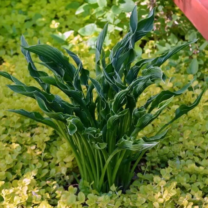 Хоста PRAYING HANDS. Высота куста 40 см. Лист жесткий, узкий, темно-зелёный, направлен вертикально вверх. Края волнистые, окантованные тонкой сливочной полоской. На нижней стороне листа выпуклые жилки. Цветки — узкие лавандовые колокольчики на высоких цветоносах, которые, на мой взгляд, малопривлекательны.