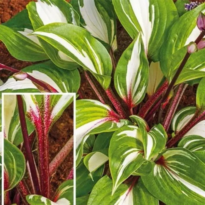 Хоста Raspberry Sundae. Потрясающий сорт с красными черешками! Редкая и очень эффектная новинка, которая моментально преобразит ваши любимые посадки! Её высота 40-45 см. Листья остроконечные, ярко-зеленые со светлым жилкованием. Черешки вертикальные, поэтому их цвет будет заметен в посадках. Сиренево-пурпурное цветение длится с июля по сентябрь.