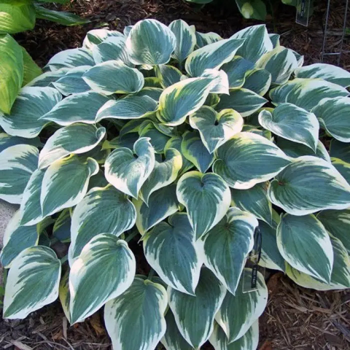 Хоста Robert Frost - Листья округлые темные сине-зеленые, плотные, слегка морщинистые, с широкой неправильной формы желто-кремовой каймой, которая становится почти белой в конце сезона. Некоторые светлые штрихи тянутся к самой середине листа. Цветы белые на высоких цветоносах. Куст высотой до 70 см. Ширина куста до 90 см. Цветоносы 90 см. Период цветения июль