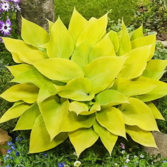 Хоста SUNNY HALCYON. Среднего размера хоста высотой 40 см и шириной 60 см. Листья весной светло-зелёные, летом жёлтые, очень яркие, копьевидные (10х8 см), рифлёные. Цветки бледно-лавандовые, на цветоносах высотой 70 см. Цветение в июле-августе. Место полутенистое или тенистое. Почва влажная дренированная. Зона 3 (до -34?С).