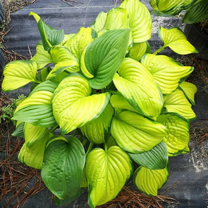 Хоста Stained Glass. Хоста с глянцевыми золотисто-желтыми листьями с узкой зеленой каймой и волнистым краем.