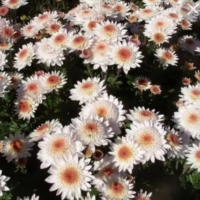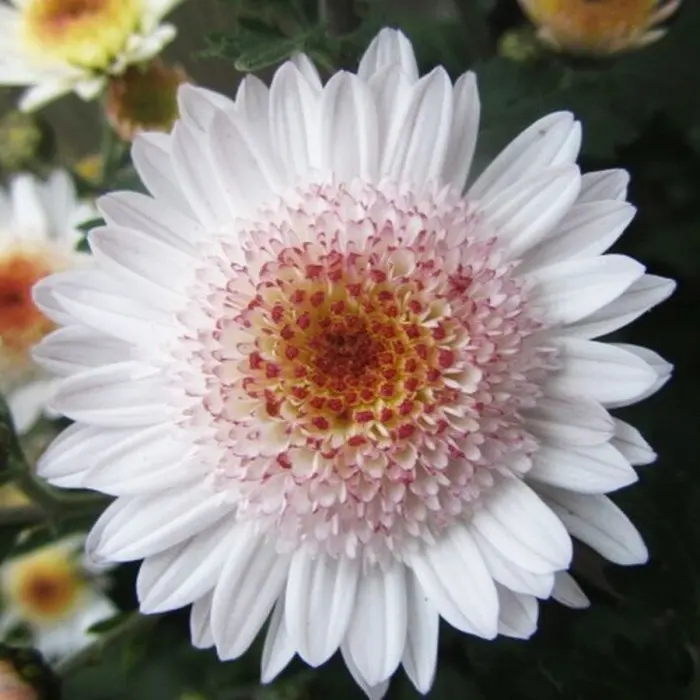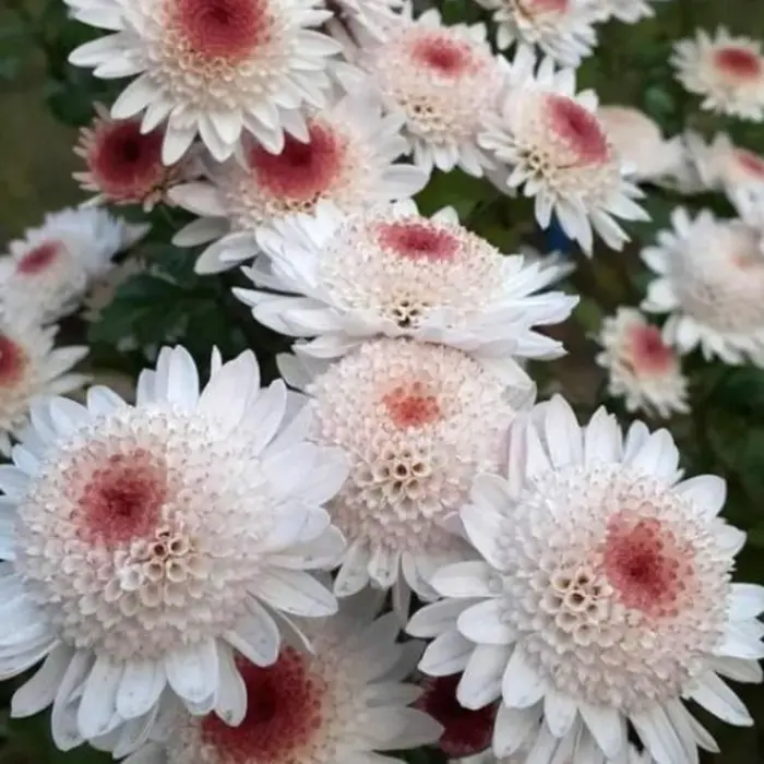 Хризантема корейская Медея. Белая с малинново- коричневым напылением по центру цветка, в полном роспуске - кипельно- белая; махровая анемоновидная - на ложе из широких лепестков располагаются трубчатые. Прекрасна для аранжировки букетов. Цветение- сентябрь-октябрь. Зимует в открытом грунте. Высота до 50 см. Цветок до 4 см.