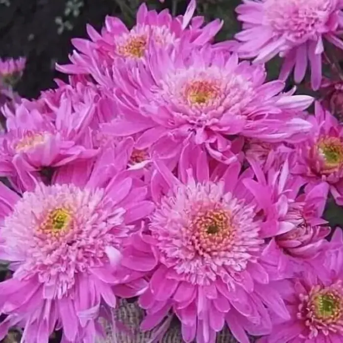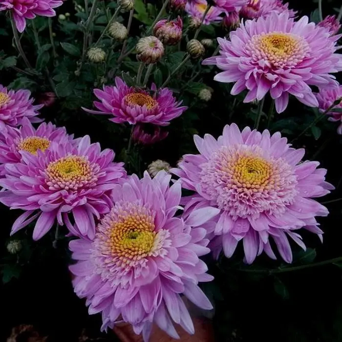 Хризантема корейская Метеорит. Высокодекоративными анемовидными цветами. Соцветие достаточно крупное, диаметром 6 см, анемоновидное, в центре крупный помпон из длинных трубчатых цветков, окруженный несколькими рядами ложноязычковых цветков (лепестков). Ложноязычковые цветки (лепестки) длинные, широкие. Окраска помпона трубчатых цветков бело-розовая, в центре – лимонно-желатая; ложноязычковые цветки окрашены в приятный светло-розово-сиреневый оттенок. Высота до 70 см.