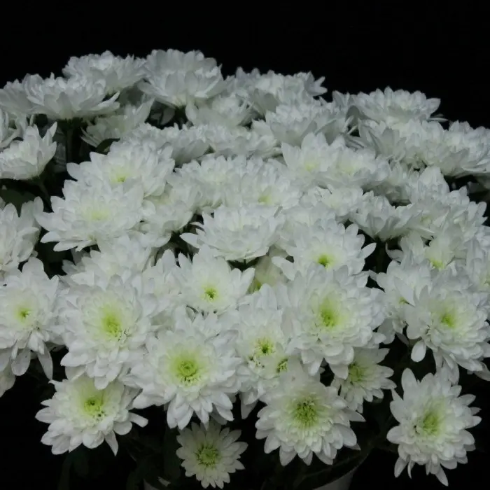 Хризантема садовая Baltica White. Высотой до 70 см. Многолетнее среднерослое растение с прямостоячими, разветвленными стеблями. Листья насыщенно-зеленого цвета. Соцветия крупные, чисто белые, махровые со светло-зеленым центром. Диаметр соцветия - 90 мм, внутреннего диска - 20 мм.