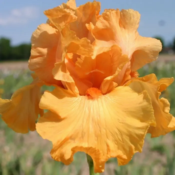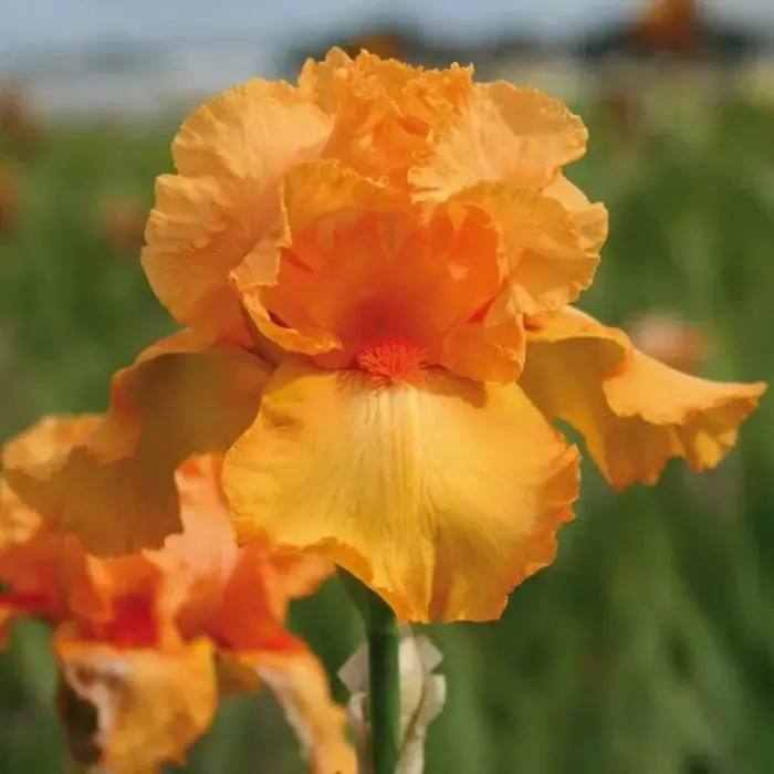 Ирис бородатый China Dragon. Высота растения до 90 см. Цветок крупный, ярко-оранжевый, края лепестков сильно гофрированны. цветки оригинальной формы, на прочном разветвленном цветоносе. На наружных долях околоцветника бородка из густых волосков. Листья мечевидные, с восковым налетом собраны в вееровидные пучки. Цветение июнь-июль.
