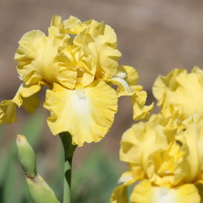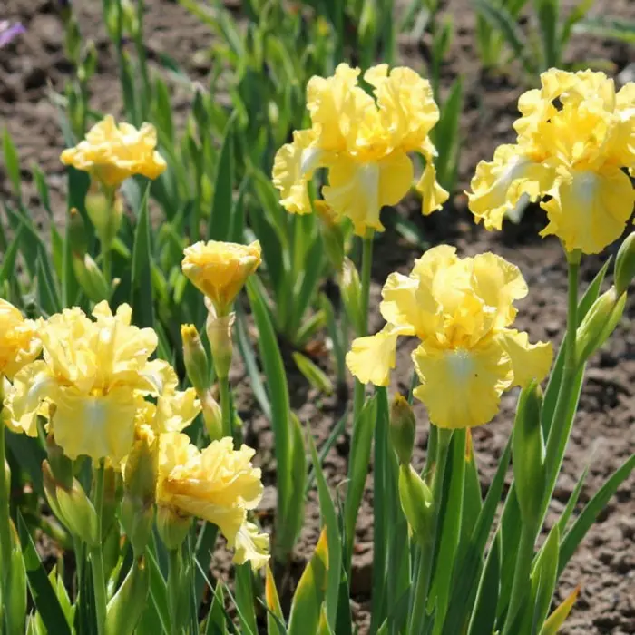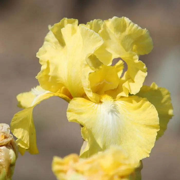 Ирис бородатый Lemon Pop. Высота растения 40 см, цветок лимонно-желтый, края слегка гофрированные. На фолах в районе бородки белое пятно.цветки оригинальной формы, на прочном разветвленном цветоносе. На наружных долях околоцветника бородка из густых волосков. Листья мечевидные, с восковым налетом собраны в вееровидные пучки. Цветение июнь-июль.