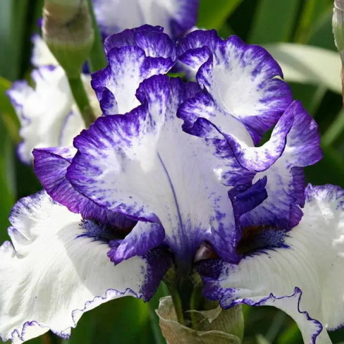 Ирис Stitch in Time. Оригинальны и эффектный ирис германский Стич ин Тайм всегда будет на виду благодаря своей яркой окраске. Двухцветные цветки особенно красивы в период своего цветения. Яркие летние синие и фиолетовые оттенки цветков вкупе с блеском темной зеленой листвы выделяют растение на любом фоне. Сорт отличается неприхотливостью, при выращивании достаточно регулярного, но не обильного полива и соблюдения простых правил агротехники. Сорт устойчив к заморозкам, не боится вредителей, предпочитает солнечные участки.
